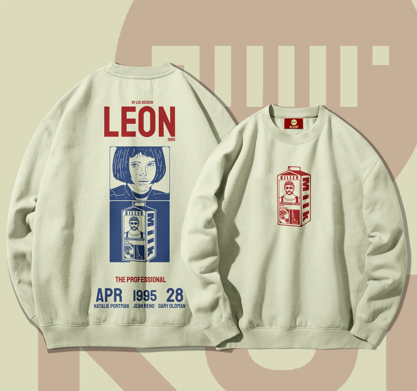 Léon’un dünyası sade ama sarsıcıydı. Kuf Studio’nun bu tasarımı da aynı o film gibi. Mathilda’nın illüstrasyonu ve o meşhur süt detayı, serigrafi baskıyla sweatshirt kumaşına aktarıldı.
