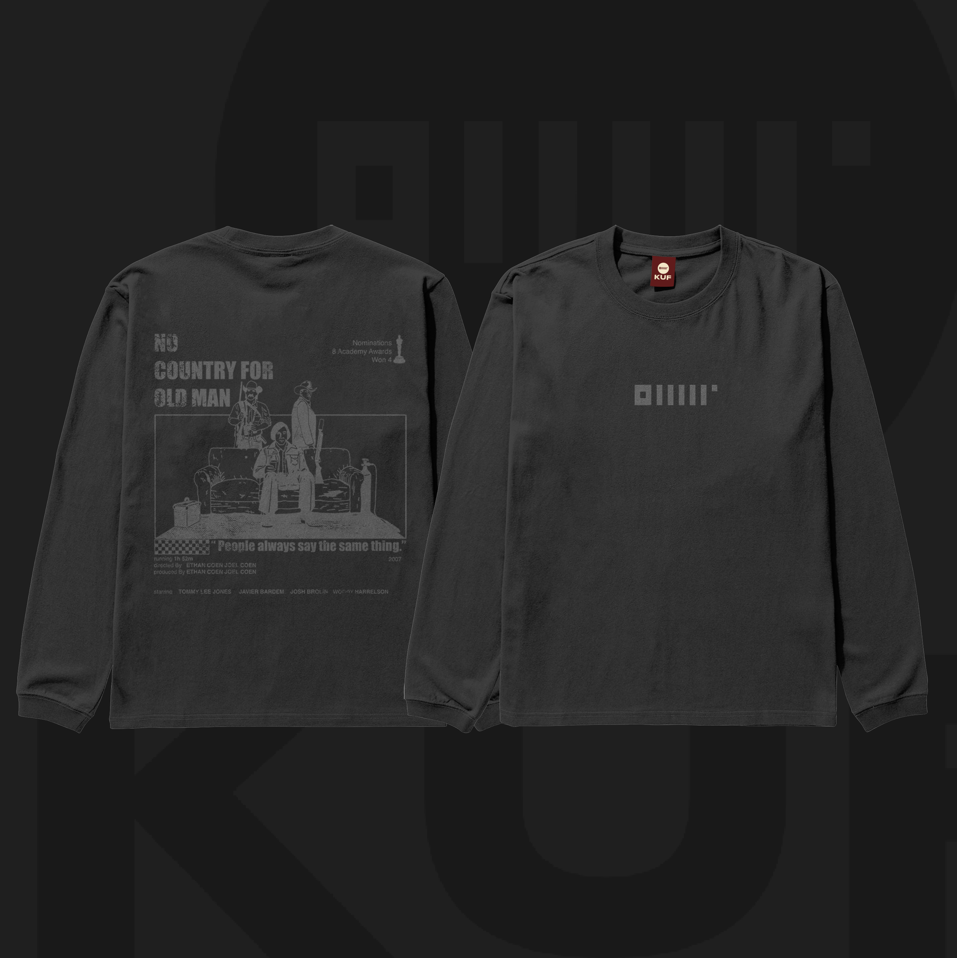 Sessiz, sert ve anlamlı bir sahne… “No Country for Old Men” tasarımı, filmden ilham alınarak Kuf Studio tarafından elle çizildi. Serigrafi baskı tekniğiyle, tek tek kumaşa aktarıldı. Her biri el baskısıyla hazırlandığı için her sweatshirt biraz kendine has, biraz senin gibi.