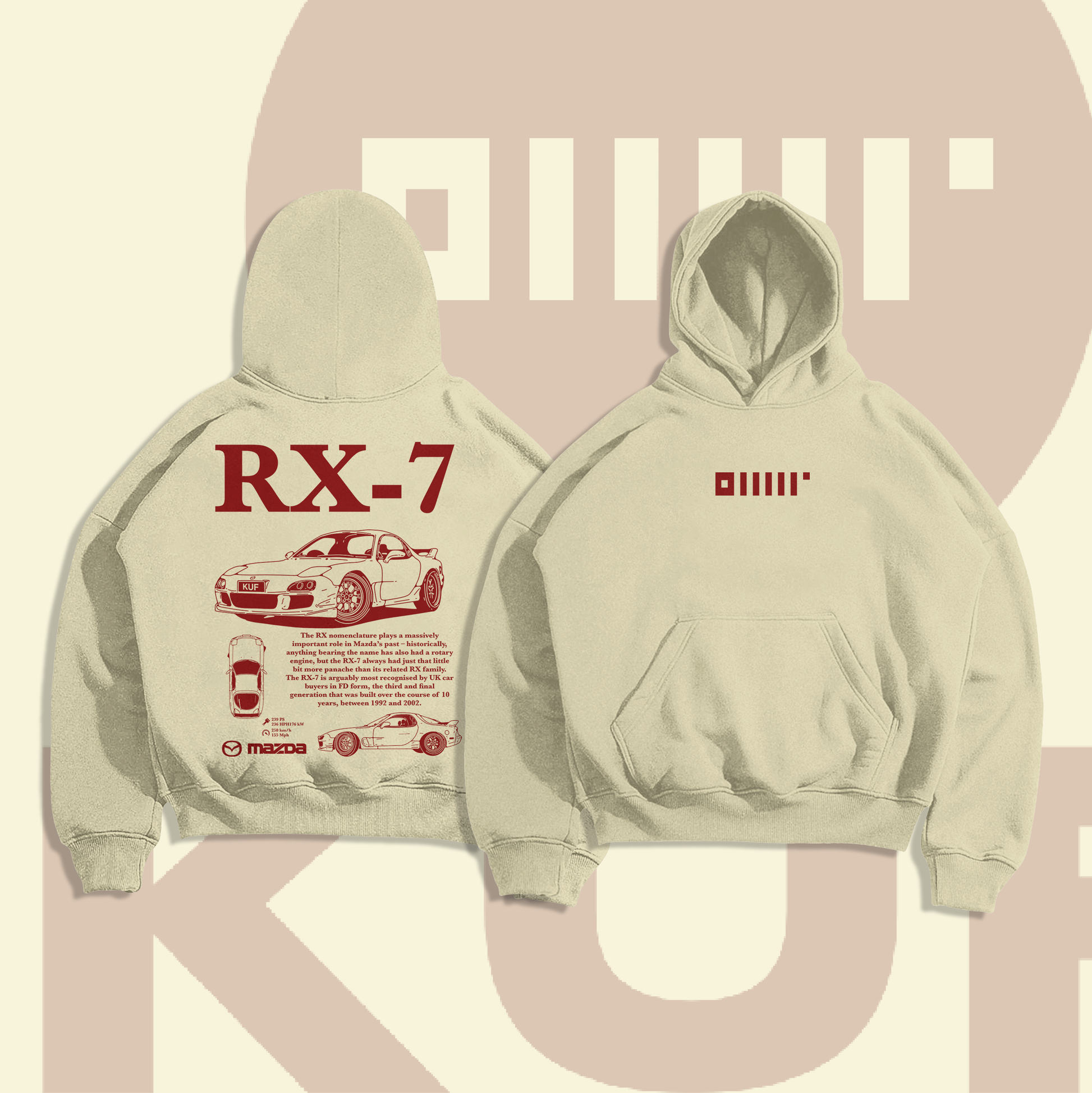 RX-7 sadece bir araba değil, bir karakterdir. Bu hoodie de onun tekstil hali gibi.